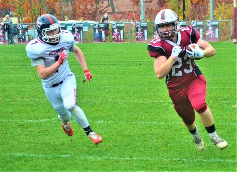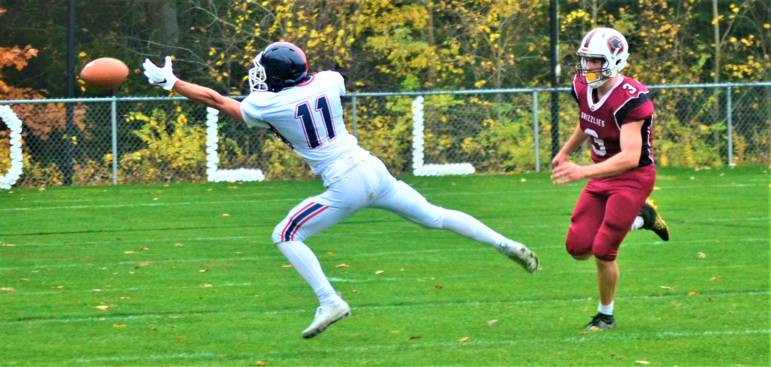 That would mark the first of three interceptions on the day for Memorial quarterback Jeffrey Josefik, with Goffstown junior Toby Halpern immediately forcing a fumble on a completed pass to Christian Sebo that would turn into a Goffstown score.