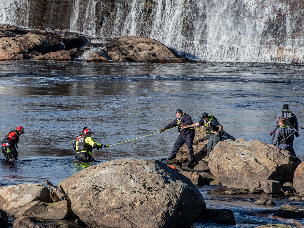 Firefighters with protective gear and personal floatation devices walked into the river towards the man who was running through the river and shortly stopping to rest on rocks. After about 1ยฝ hours in the frigid water, the man stopped to take a rest and firefighters approached him. With the assistance of police officers, firefighters, and professionals from Manchester Mental Health the man was convinced to come to the shore on the east side of the river.