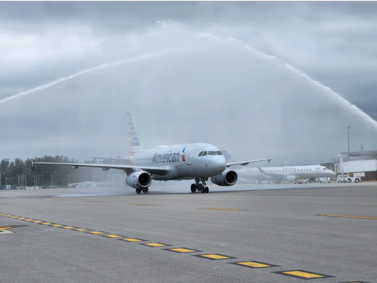 A water salute was offered to American Airlines as it renewed its route from MHT to Chicago-O’Hare (ORD). The MHT-ORD route was paused in January, but has now returned with two daily flights with 76-seat Embrarer ERJ-175 planes.