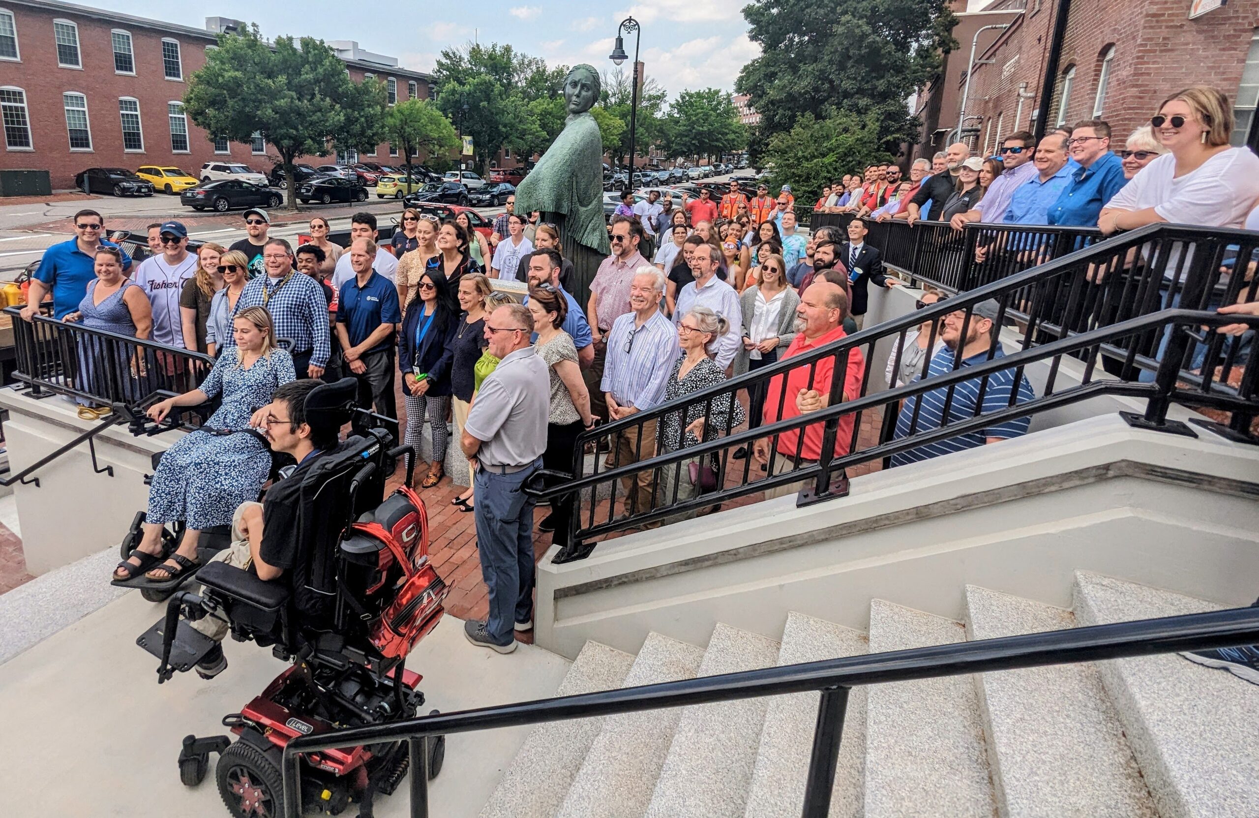 Manchester Connects, a grassroots community action group working to reshape downtown partnered on the project with the city architect Steve Hebsch and Matt Low, COO of engineering firm Hoyle, Tanner & Associates, to redesign the area that would relocate the statue, build an Americans-with-Disabilities-Act-compliant ramp, install colored light fixtures in a new set of stairs, and an expanded seating area.