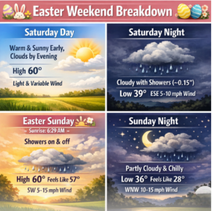Sunday: (Sunrise services will be at approximately 6:29โฏAM.) Periods of showers (.25″) & warm High 60 (feel like 57) Winds: SW 5-15 mph