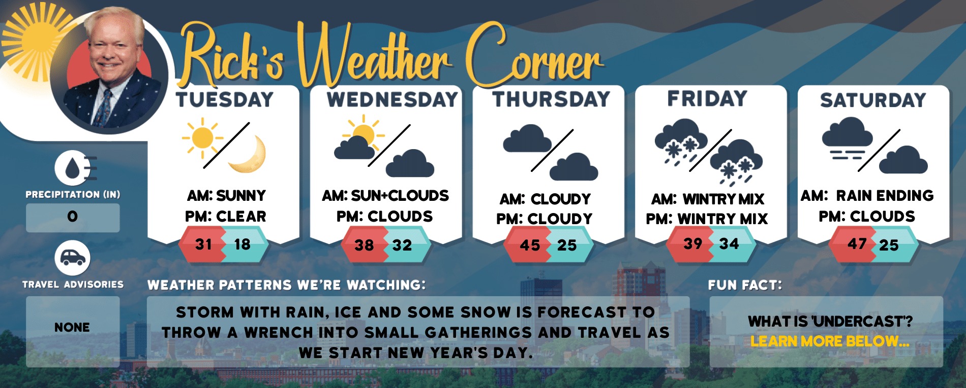 A storm with rain, ice and some snow is forecast to throw a wrench into small gatherings and travel as we start New Year’s day.