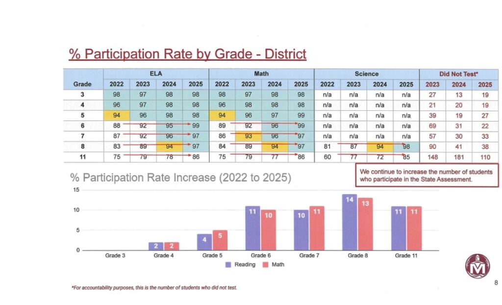 These scores were impacted by low participation rates in the 11th grade assessments, as grades holding participation percentages under 95 percent seeing their proficiency rates are negatively impacted. However, those assessments were the only ones with participation rates under 95 percent in 2025, compared to all grades except for grade 3 and 4 missing that benchmark in 2022.