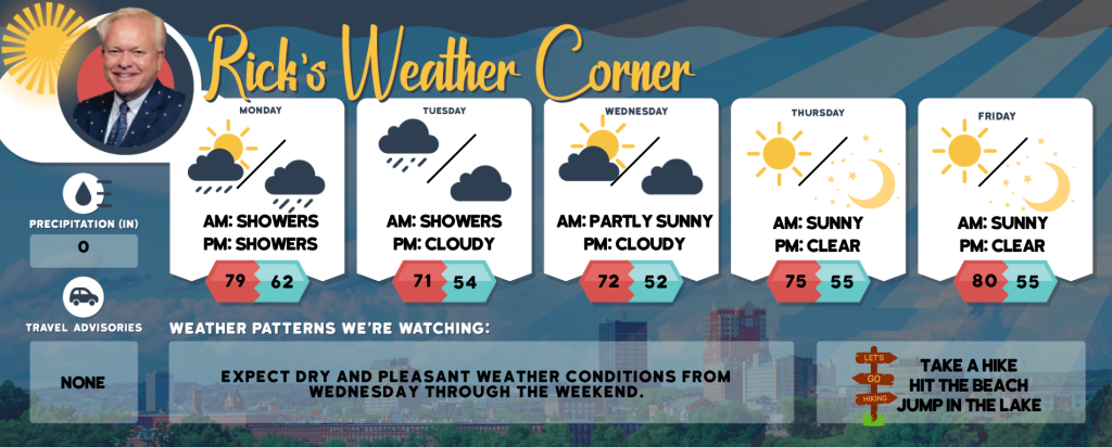 Tuesday: Expect lower humidity with early rain showers followed by sunshine later in the day. High 71 Winds: NW 10-15 mph