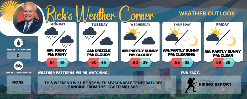 Friday: Mostly sunny, breezy, & cool. High 59 (feel like 53) Winds: NW 10-15+ mph