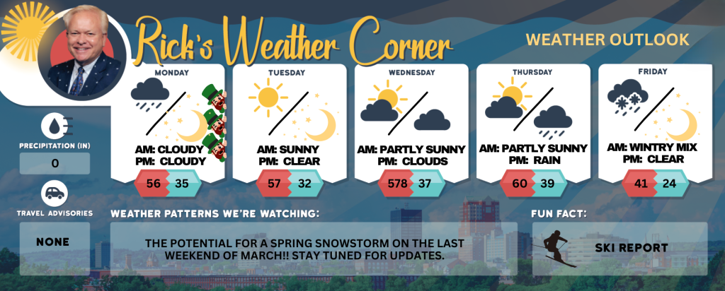 Get ready to welcome the first weekend of Spring with open arms! Enjoy a delightful mix of sunshine and dry weather, as temperatures warm up into the pleasant 50s. It’s the perfect opportunity to embrace the outdoors and soak in the refreshing vibes of the season!.