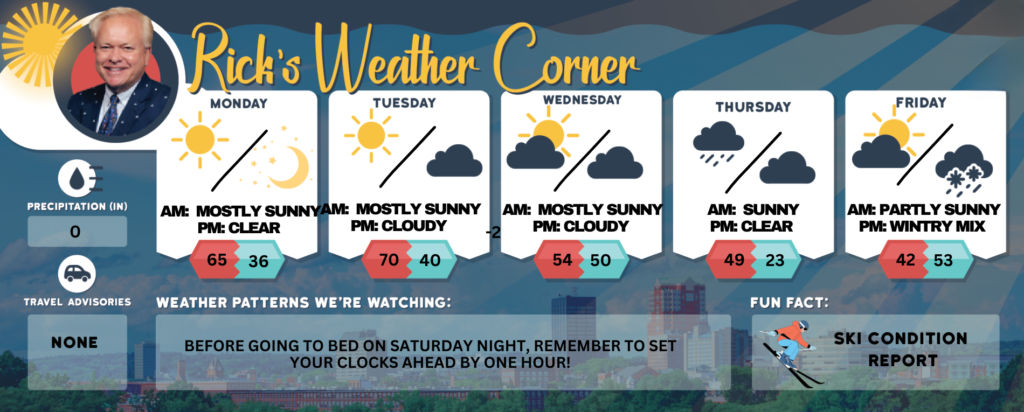 It’s a lovely day ahead! Expect a delightful mix of sunshine and clouds, with temperatures reaching a warm high of 64 degrees. With a gentle southwest breeze blowing at 10 to 15 mph, it’s the perfect weather to get outside and enjoy the fresh air and watch the snow melt!
