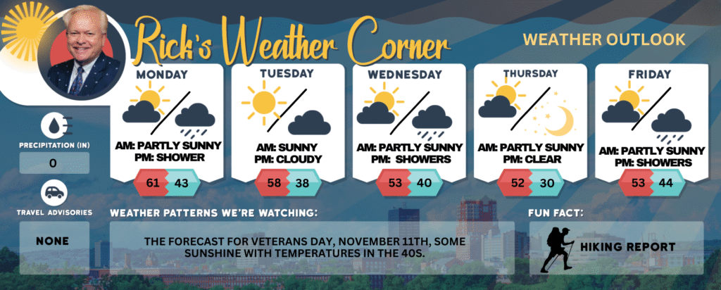The forecast for Veterans Day, November 11th, some sunshine with temperatures in the 40s.
