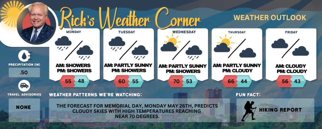The forecast for Memorial Day, Monday May 26th, predicts cloudy skies with high temperatures reaching near 70 degrees.