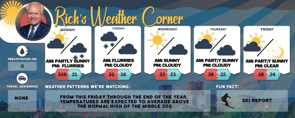 From this Friday through the end of the year, temperatures are expected to average above the normal high of the middle 30s.
