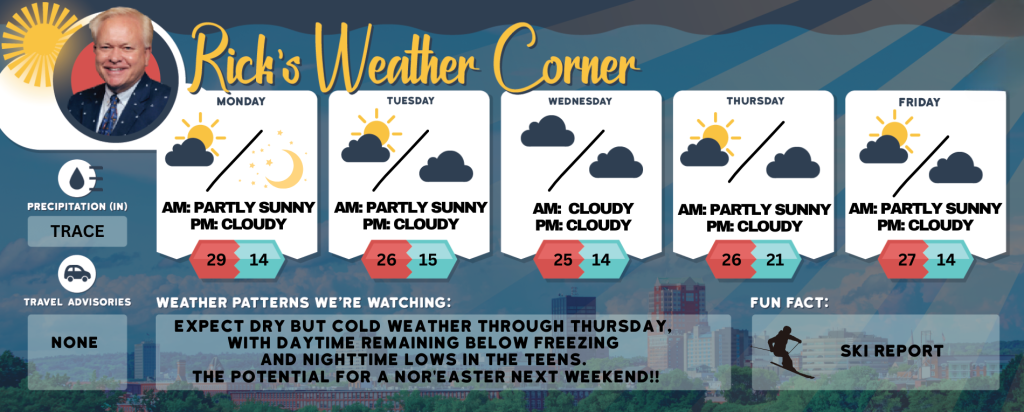 Expect dry but cold weather through Thursday, with daytime remaining below freezing and nighttime lows in the teens. The potential for a Nor’easter next weekend!!