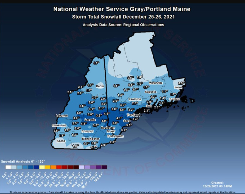 The map of snowfall reports received from Christmas day into yesterday morning.