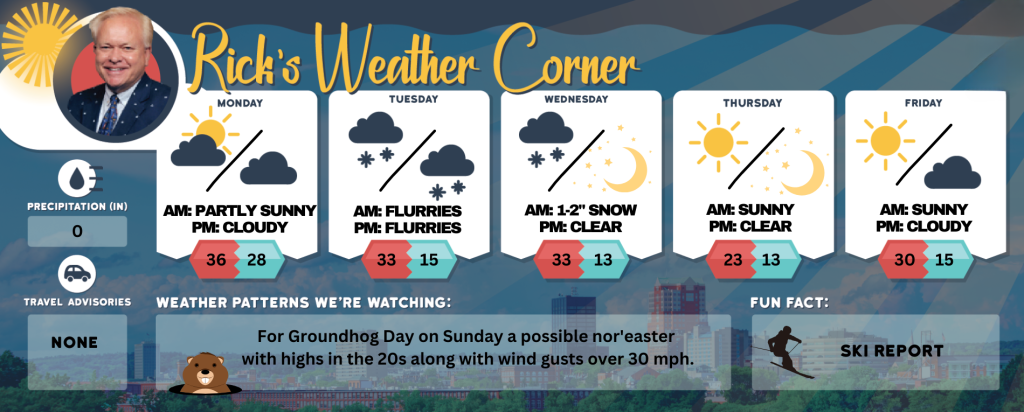 For Groundhog Day on Sunday a possible nor’easter with highs in the 20s along with wind gusts over 30 mph.