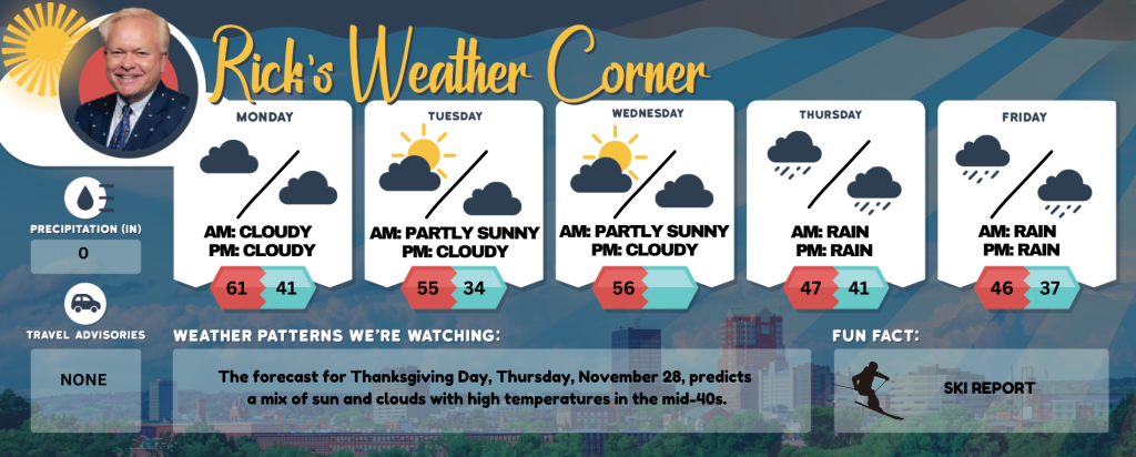 The forecast for Thanksgiving Day, Thursday, November 28, predicts a mix of sun and clouds with high temperatures in the mid-40s.