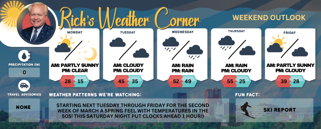 Starting next Tuesday through Friday for the second week of March a spring feel with temperatures in the 50s! (This Saturday night put clocks ahead 1 hour!)