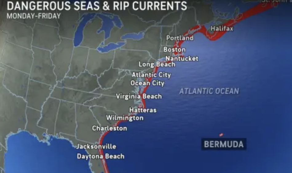 A powerful offshore hurricane can produce massive and dangerous waves well away from its center. Beaches along the entire East Coast, from Florida to New England and Atlantic Canada, will likely experience rough surf and dangerous rip currents as Erin tracks north and eventually northeast from south to north along the U.S. Atlantic coast as the week progresses.