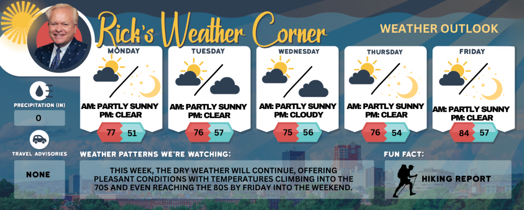 This week, the dry weather will continue, offering pleasant conditions with temperatures climbing into the 70s and even reaching the 80s by Friday into the weekend.