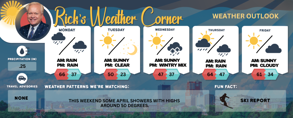 Tuesday (April 1st): Mostly sunny, windy, and cooler. High 50 (feel like 43) Winds: NW 20-25+ mph
