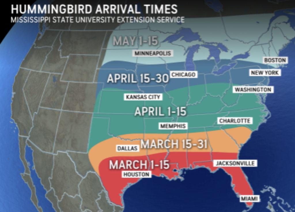 After spending the winter in Central and South America, ruby-throated hummingbirds commence their migration to the United States, arriving along the Gulf Coast in early March, according to the Mississippi State University Extension Service. They gradually disperse across numerous states east of the Rocky Mountains throughout the spring and are expected to arrive here in early May.