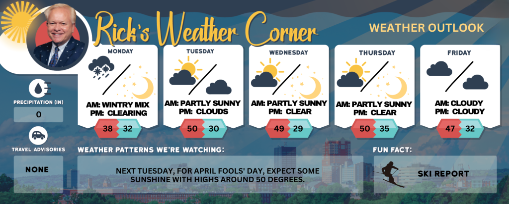 Today: Wet snow (less than 1″) to a cold rain by the afternoon. High 38 (feel like 33) Winds: E 5-10 mph