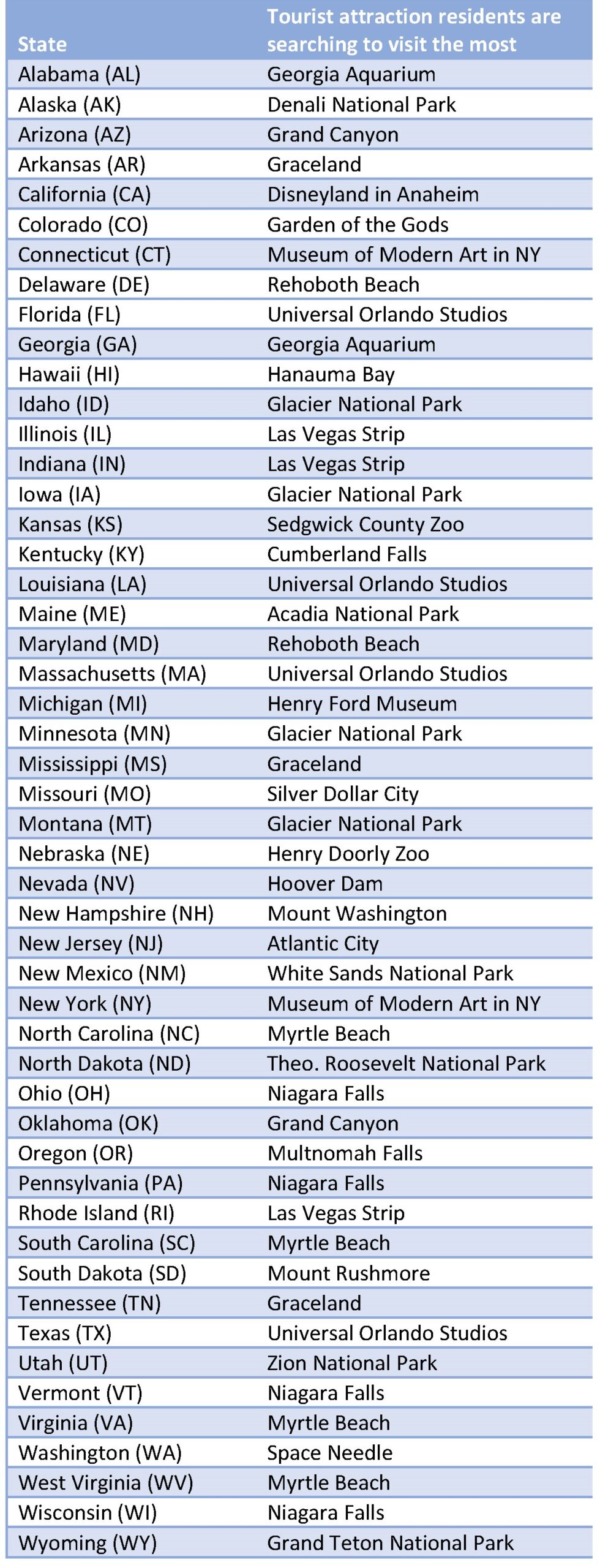 The website, which promotes family destination vacations, analyzed Google search data for more than 100 tourist attractions in the U.S., as well as terms related to visiting each attraction to determine which is the most Googled in each state.