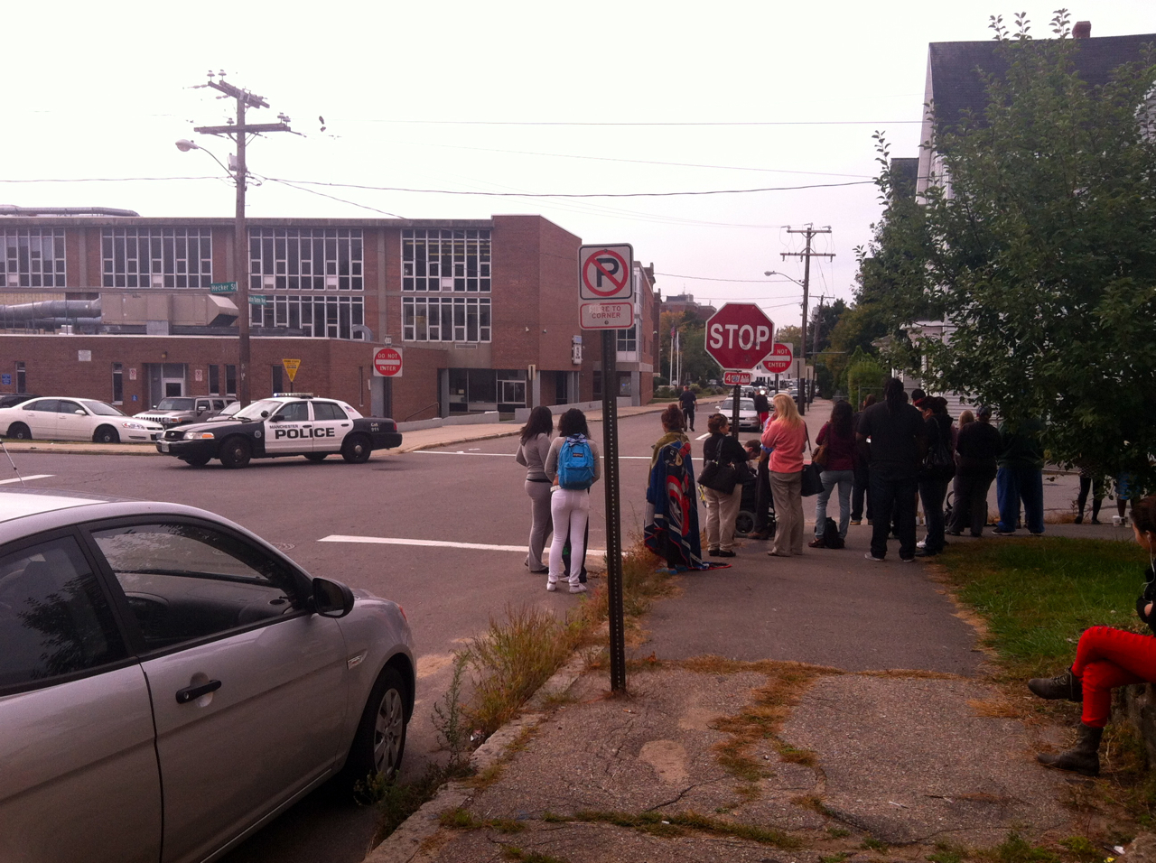 FILE PHOTO: Neighbors stand behind police tape outside West high School during an emergency lockdown in 2014.