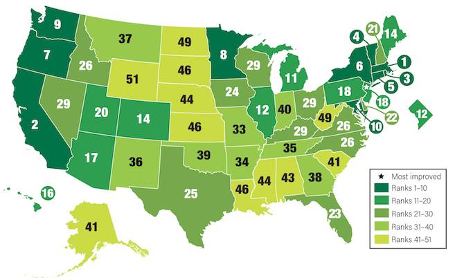 This is a problem not because southern states are less evolved than New Hampshire but because their mellower climates make energy efficiency less of an imperative than it should be here. Texas (ranked no. 25) can afford to be complacent because it is the Saudi Arabia of wind power and, if memory serves, they have some native fossil fuel resources down there as well.