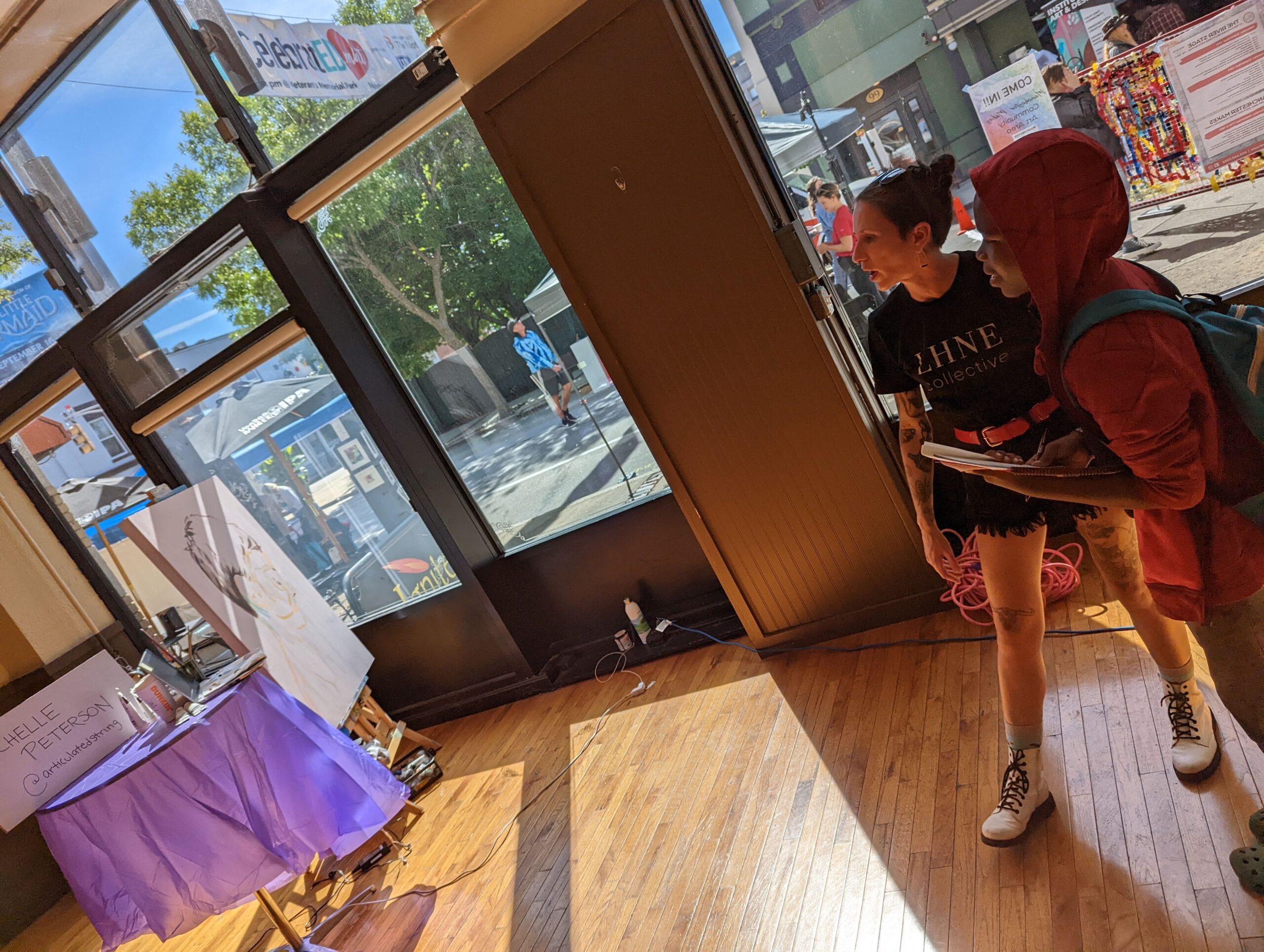 Anyway, when I was walking on the street, the first people I met were Jozimar and Chau. They work for Manchester Arts Commission. They also have a gallery space at city hall and their mission is to bring arts into the community. I make art too, so one day I am hoping to be in this gallery. Yasamin says it is a gallery for the city.