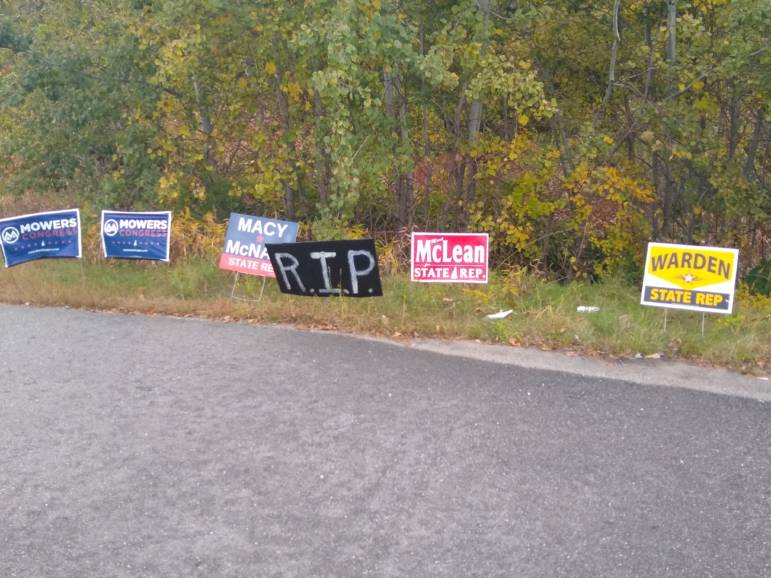 Several of the signs, which say โR.I.P.โ, common shorthand for “Rest in Peace,” appear to be repurposed signs from Don Bolduc, one of the unsuccessful challengers for the GOP U.S. Senate nomination.