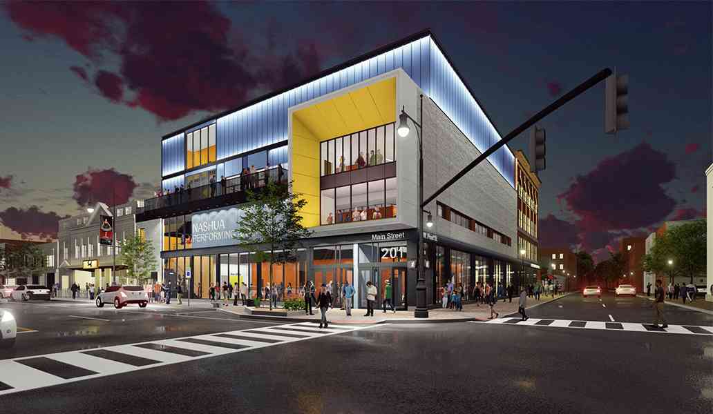 The Nashua Performing Arts Center will be located at 201 Main Street in the heart of downtown Nashua. Designed by ICON Architecture, it will be a flexible venue with retractable seats in the main-floor audience chamber to accommodate diverse theatrical and musical performances, comedy, family shows, corporate and non-profit events, and celebrations such as weddings and other private gatherings. The Performing Arts Center will seat up to 750, hold up to 1,000 standing, and offer banquet seating for 270 people.ย