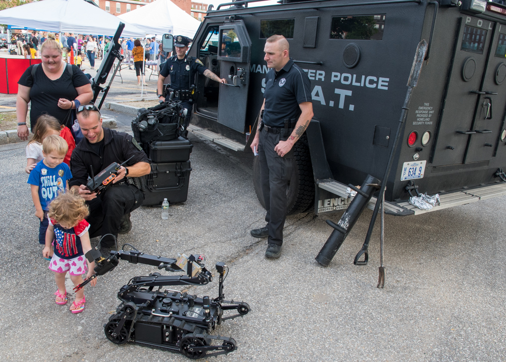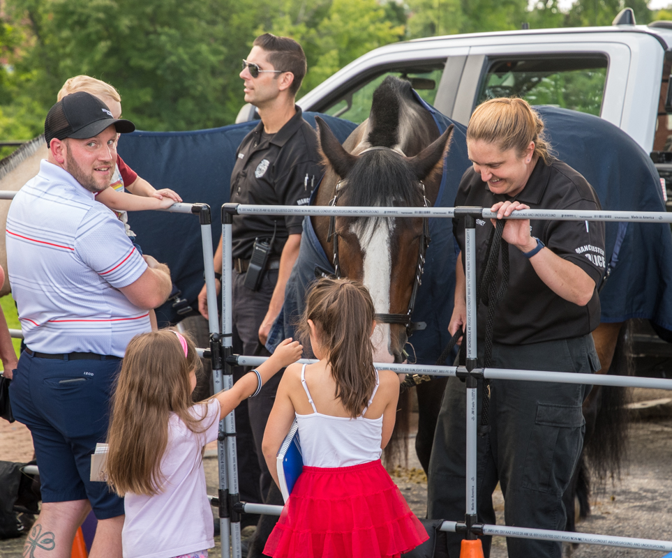 Kids got up close and personal with the city’s two Mounted Patrol horses, Enzo and General, climbed aboard a SWAT vehicle, did target practice at the SAFE (Students and Families Experiencing) Archery display, and watched motorcycle cops from the Manchester Police Department’s traffic division ride through an obstacle course.