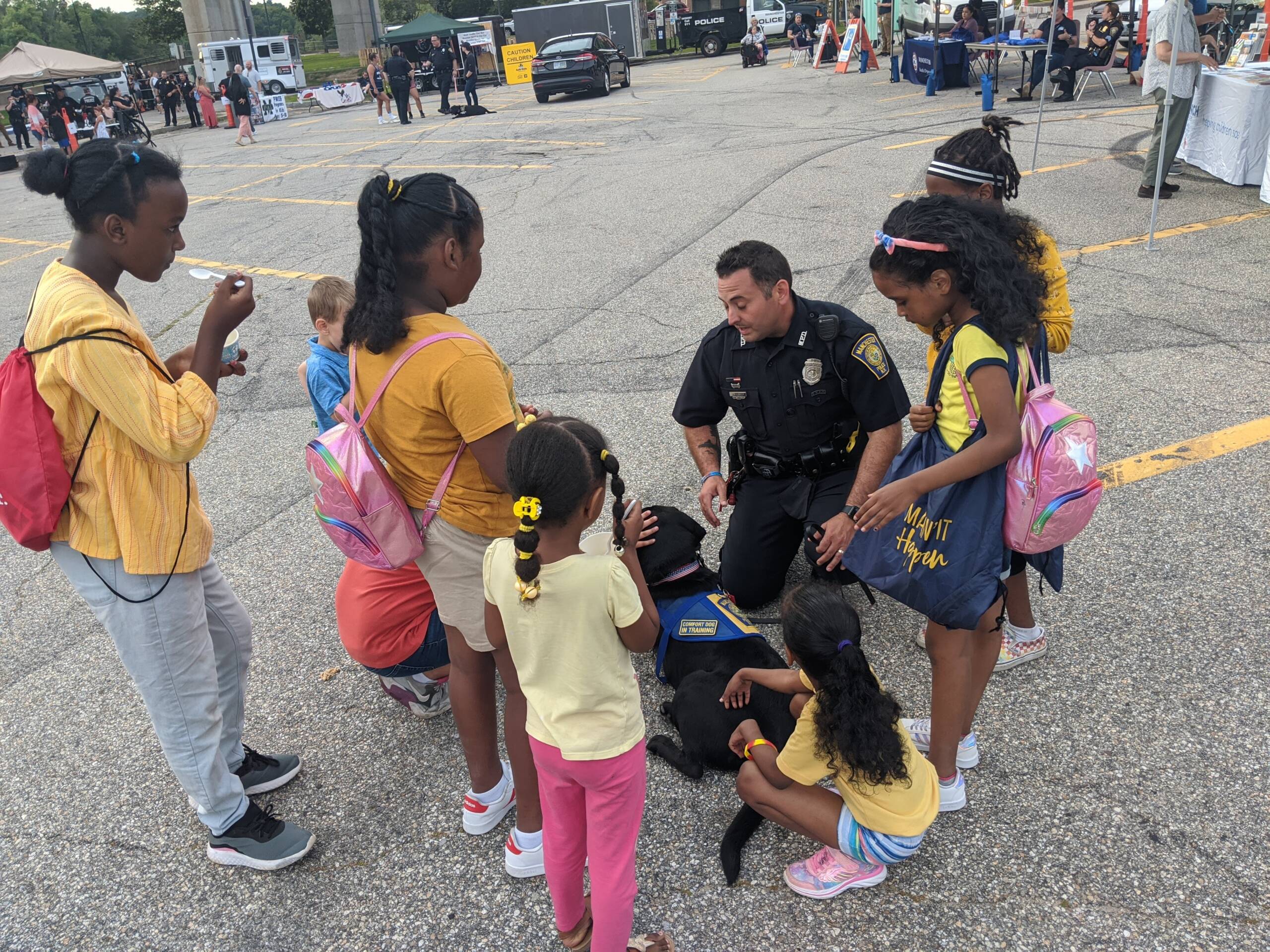 One of the main attractions for the kids was learning more about Patch, Manchester Police Department’s “comfort dog,” which joined the force in January of 2020. The black lab-mix was a rescue dog, which now provides comfort and affection to people in hospitals, nursing homes, schools.
