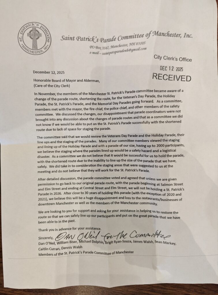 Following a lengthy back-and-forth regarding how parades should be organized during the Dec. 3, 2025 Board of Mayor and Aldermen (BMA) meeting, a letter has been submitted into the public record from the Saint Patrick’s Day Parade Committee of Manchester continuing concerns noted during that discussion.