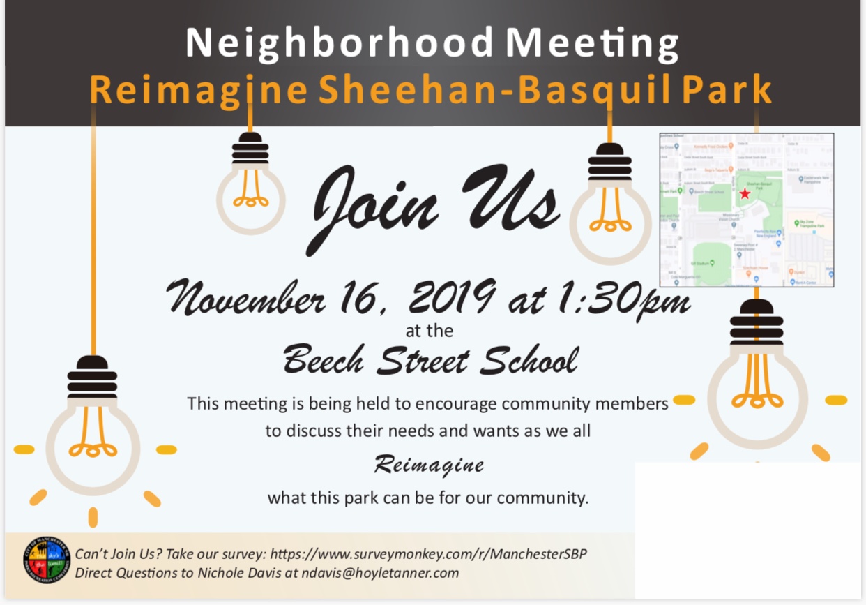 There will be an open house-style public meeting held today from 1:30-3 p.m. in the Beech Street School cafeteria to discuss what the residents would like to see changed at the Sheehan-Basquil Park. The City has partnered with Hoyle, Tanner & Associates, Inc to redesign the park and improve the accommodations for everyone using the park. We encourage everyone to stop in and share their thoughts! Canโt make it? Share your thoughts with us in this survey: https://www.surveymonkey.com/r/ManchesterSBP