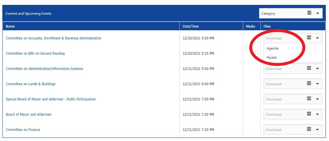 On the Friday prior to the weekly meeting, the agenda and related documentation is posted to the City of Manchester website. In the download section (see image below), you will find a drop-down for Agenda and Packet. Selecting the option for the Packet will give you the detailed information for each item on the agenda.ย If you still have questions, concerns or would like to comment on something, reach out to your Alderman.