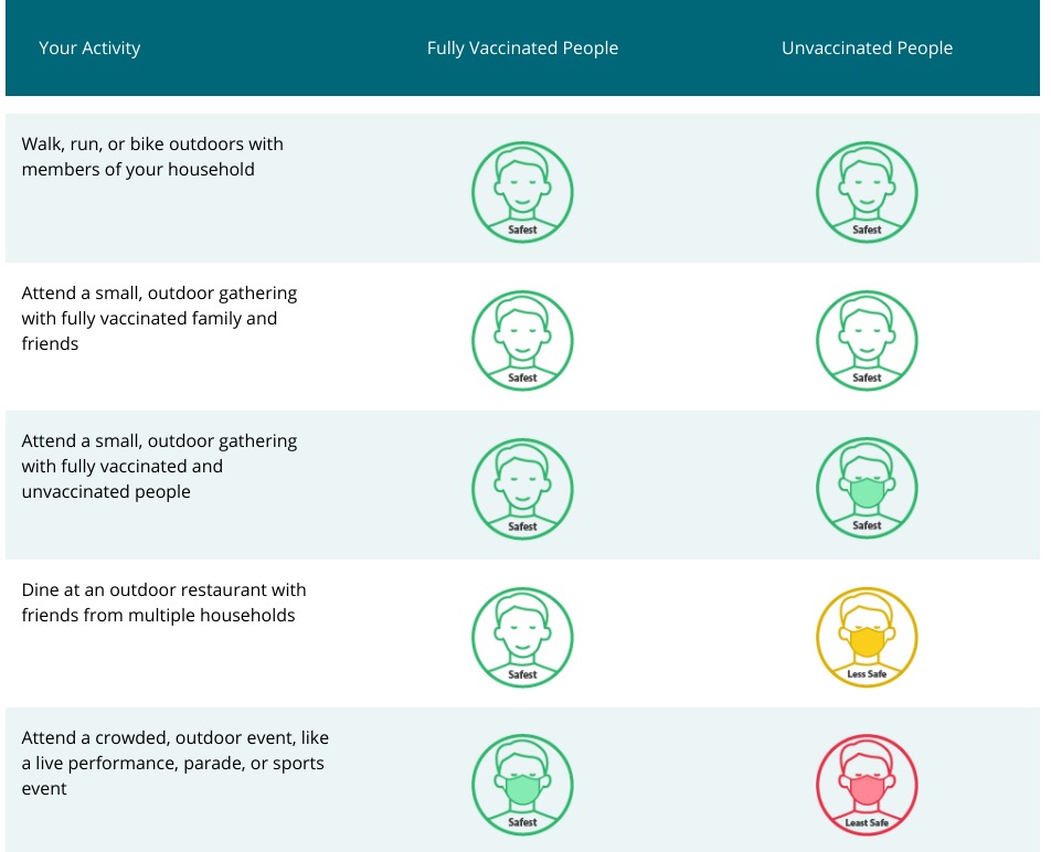 Just in time for cookouts and black flies, the Centers for Disease Control and Prevention said Tuesday fully vaccinated people can socialize and dine outdoors with a small group of friends without wearing a mask, even if those friends are unvaccinated.