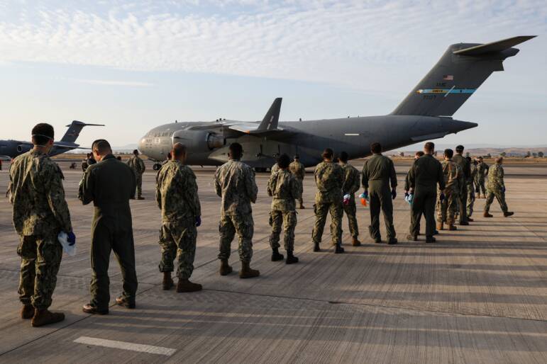 U.S. military personnel watch an U.S. Air Force C-17 Globemaster III carrying evacuees from Afghanistan land at Naval Air Station Sigonella, Italy. Promotional photo/U.S. Department of Defense