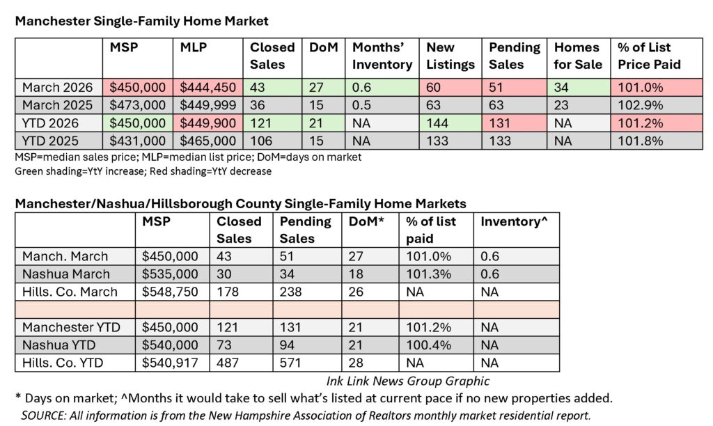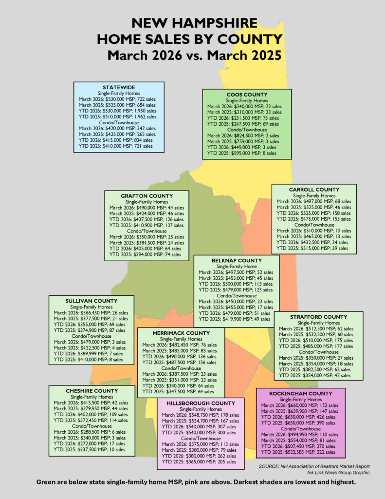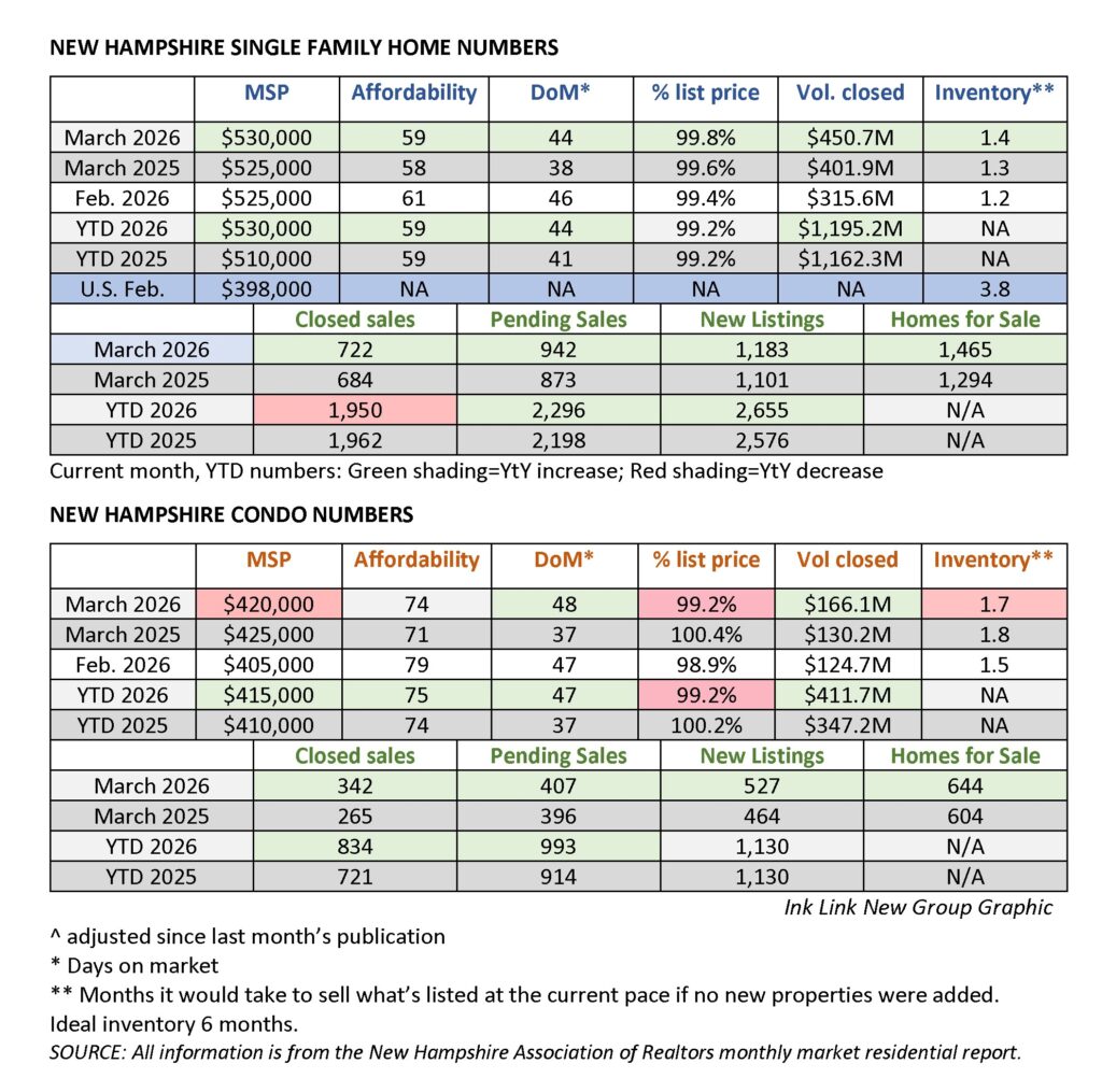 The median sales price for a single-family home in New Hampshire in March was $530,000, according to the New Hampshire Association of Realtors monthly market report. Thatโs up just 1% from March 2025, when it was $525,000, which was also Februaryโs MSP. Median means that have of the homes sold for more, half for less.