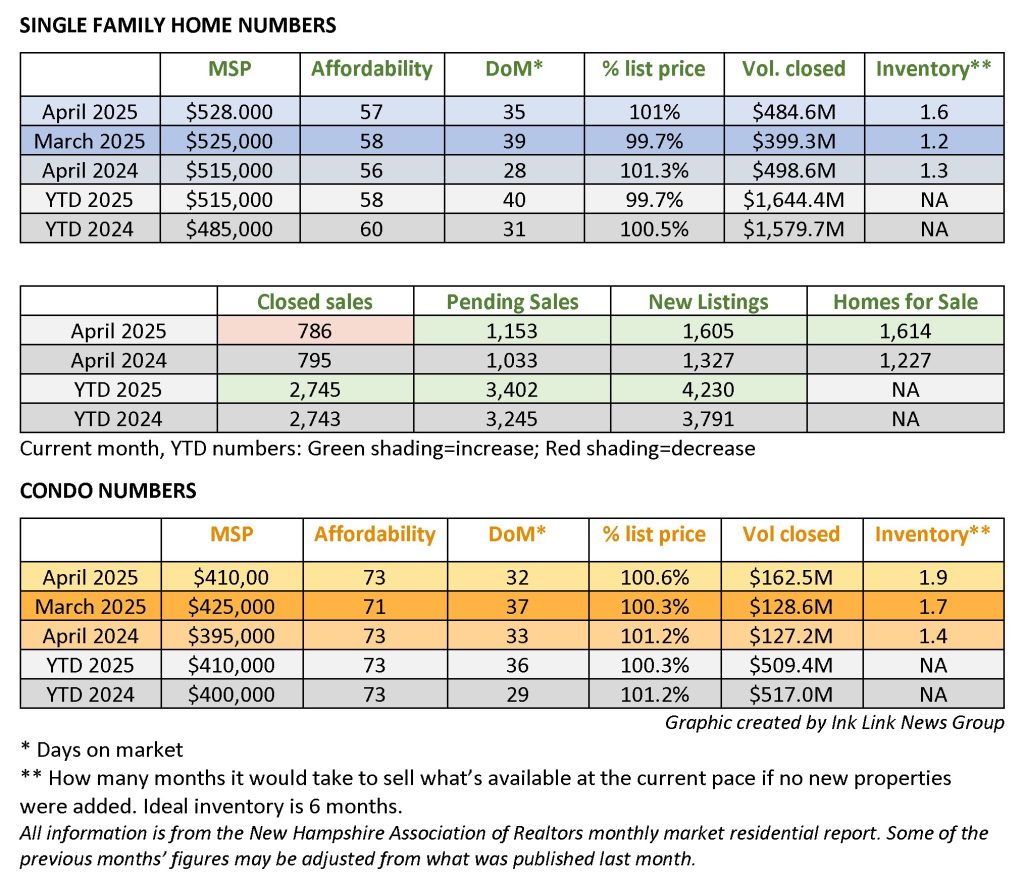 The median sales price for single-family homes sold last month was $528,000, a 2.5% increase over April 2024โs $515,000, according to the New Hampshire Association of Realtors monthly market report. Median price means that half of those who closed on a home in New Hampshire in April paid more, half paid less.
