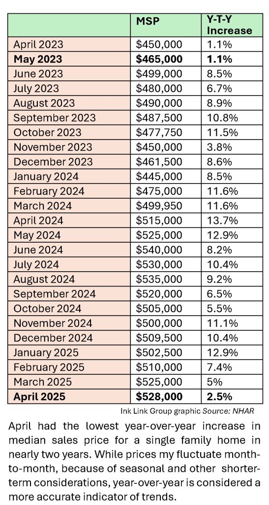 While it was an increase, it was the lowest rate year-over-year rate of increase in almost two years, when the May 2024 increase was 1.1% (to $465,000 from $460,000 in May 2022). While prices my fluctuate month-to-month, because of seasonal and other shorter-term considerations, year-over-year numbers are considered a more accurate indicator of trends.