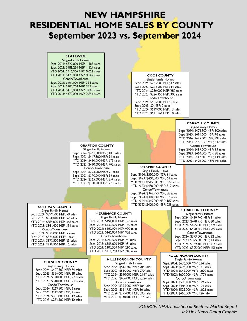 The hot county for September was Belknap, where single-family home sales were up 44.4% over September 2023. Closed sales for the month totaled 91, compared to 63 a year ago. Median sales price was $550,000, a 22.2% leap from September 2023โs $450,000. Belknap County is in the Lakes Region and includes Belmont, Gilmanton, Laconia, Tilton, Gilford, Alton, Sanbornton, Barnstead, Meredith and New Hampton.