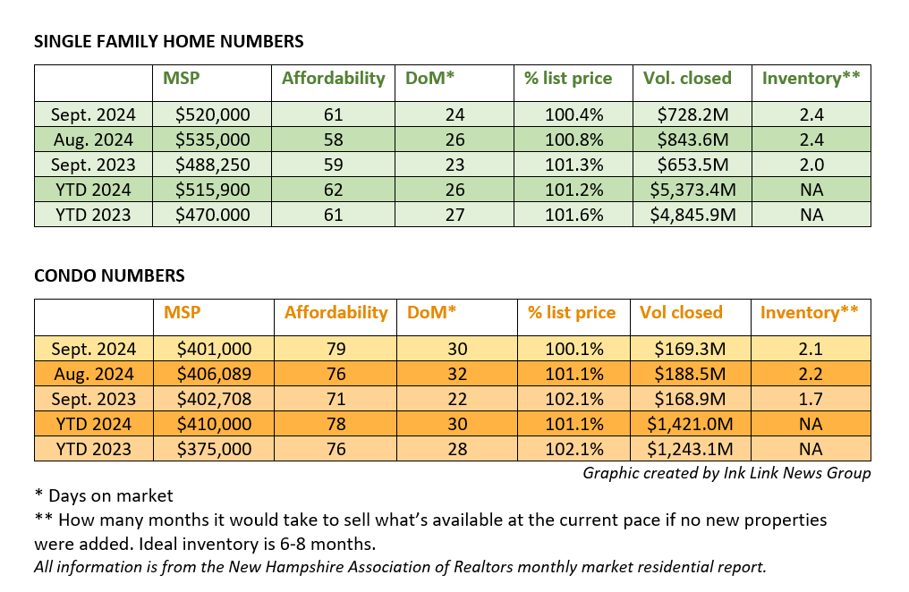 The highest New Hampshire MSP in September, $635,000, was in Rockingham County, on the seacoast, where 234 single-family homes were sold. Hillsborough County, which includes Manchester and Nashua and is the stateโs most populous, had a September MSP of $516,500, with 284 homes closed on in September.