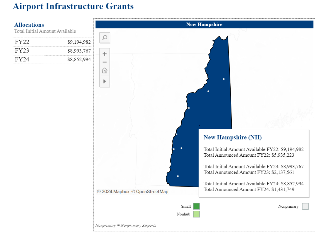 The state’s airports were allocated $9.1 million in FY 2022 and used $5.9 million. In FY 2023, New Hampshire airports were allocated $8.9 million and used $2.1 million. The program will continue into 2025 and 2026.