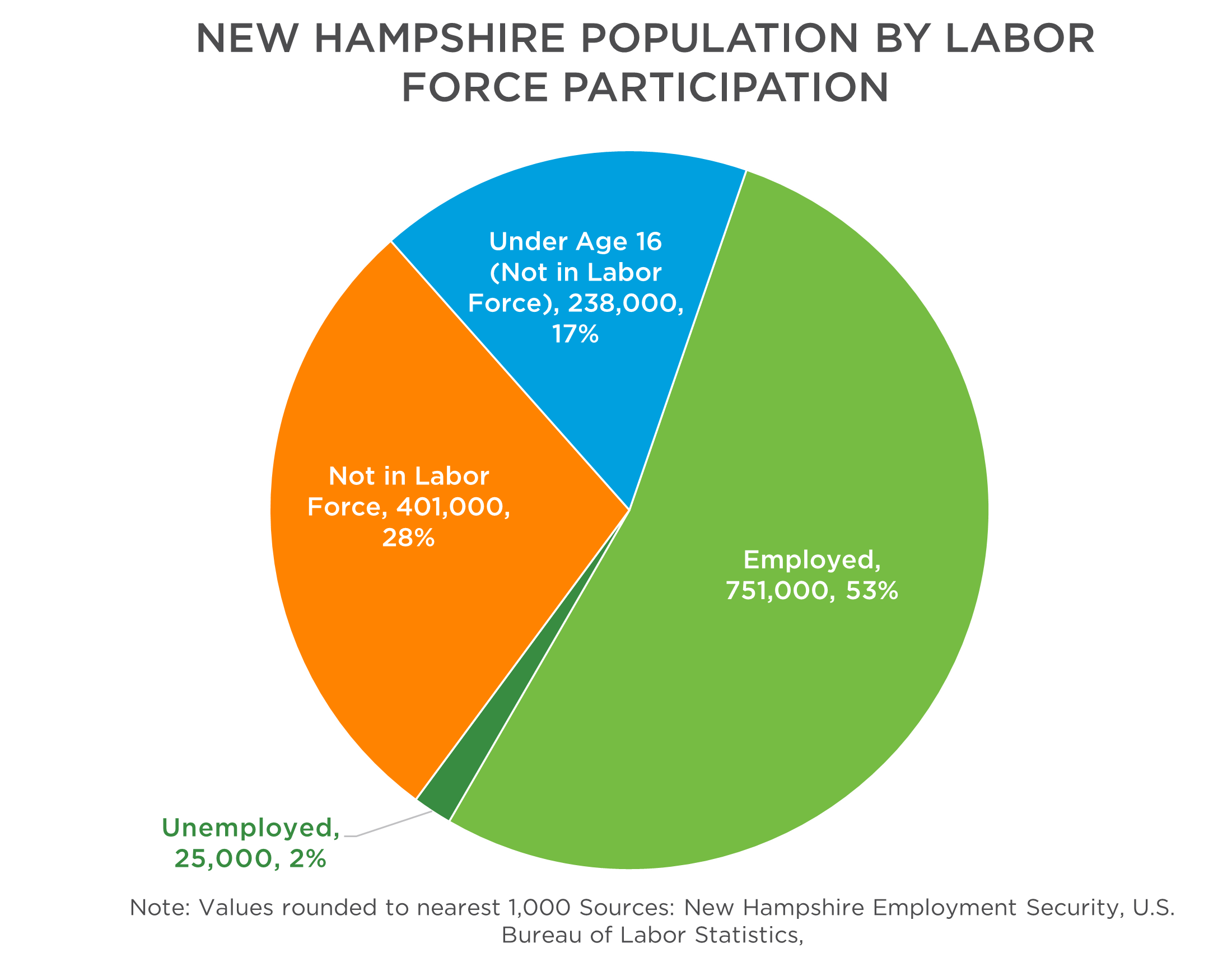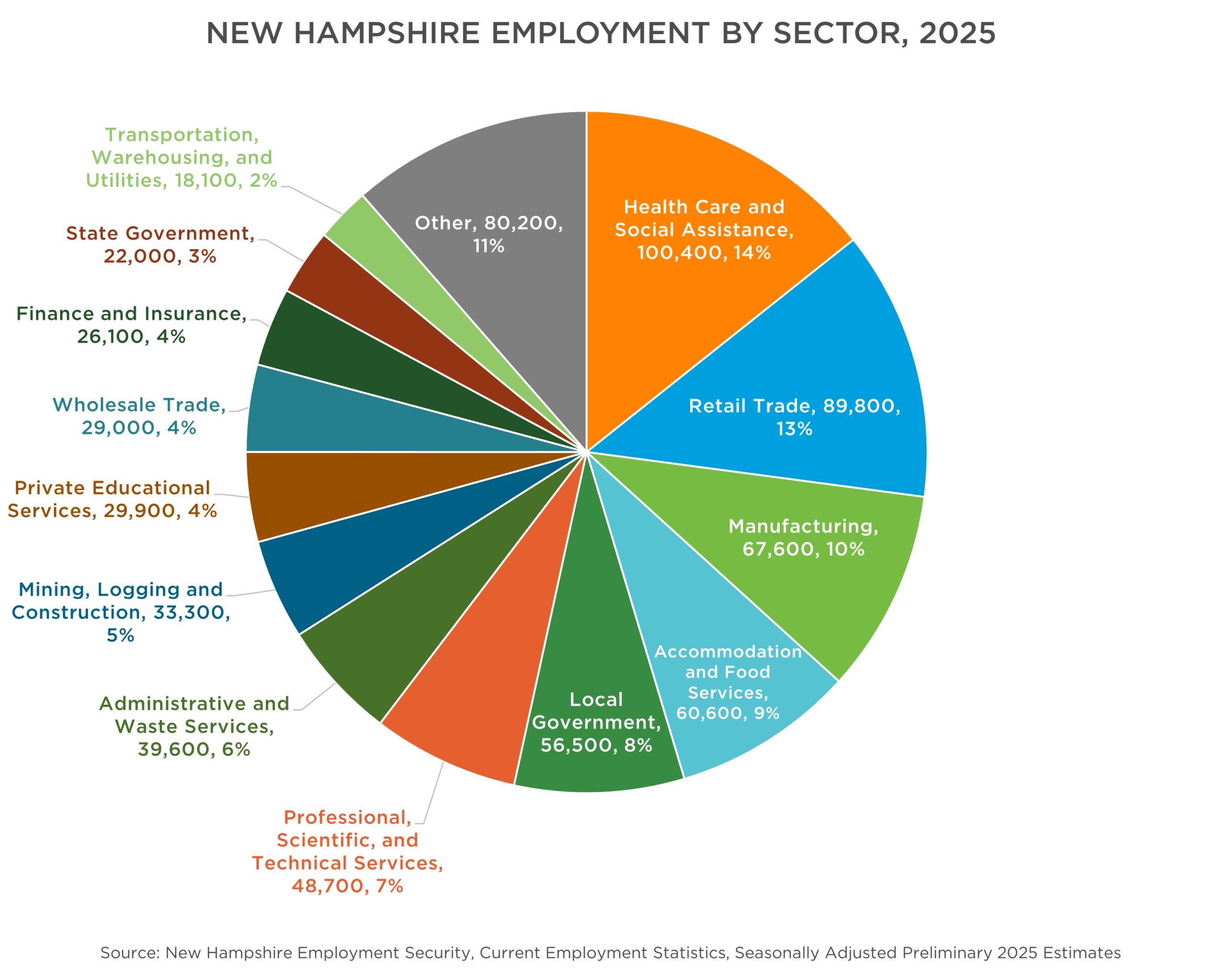 New Hampshire’s labor market weakened in 2025. Employers filled fewer jobs than they did during the previous year, the number of employed Granite Staters remained relatively flat, unemployment increased compared to the last year, and average private-sector wage growth did not keep up with inflation. Recently updated data from New Hampshire Employment Security suggest that the State’s labor market remained strong compared to its bordering states and the United States as a whole, but the tight labor market conditions of 2022 and 2023 have lessened through 2024 and 2025. Despite market changes in 2025, unemployment remains low and New Hampshire industry employment mostly remains steady.