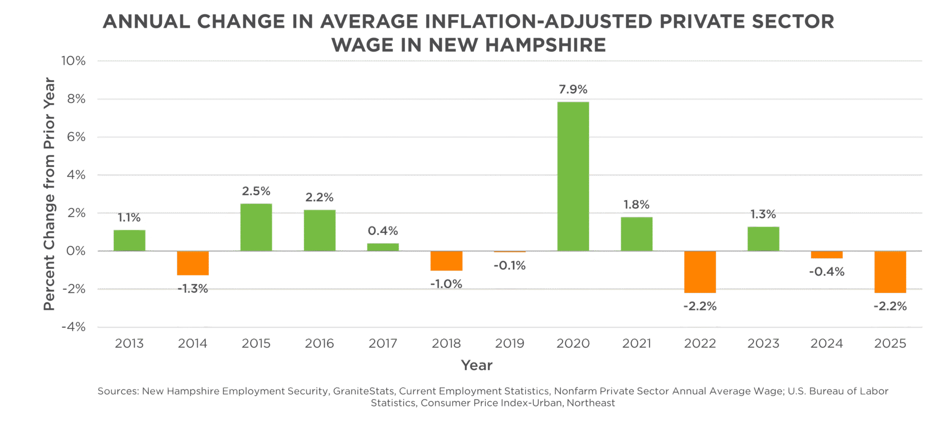 Wage growth also slowed in 2025. New Hampshire’s average hourly wage nominally increased by less than 1% from 2024 ($35.22) to 2025 ($35.53). After adjusting for inflation, however, the average wage fell from $36.33 in 2025 dollars to $35.53, a 2.2% decrease.