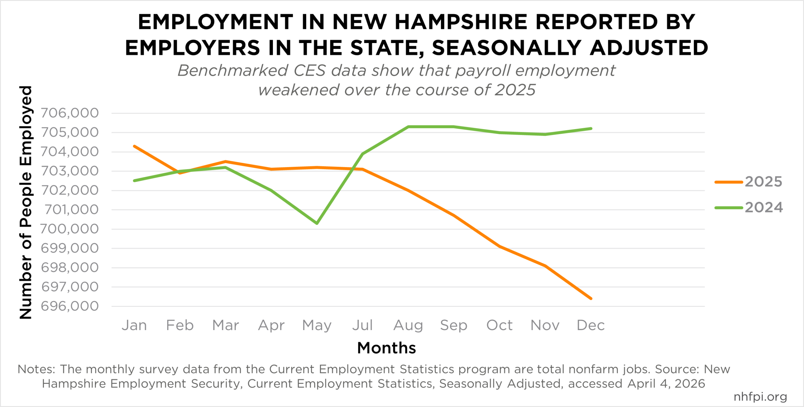The latest benchmarked employment data suggests that employers in New Hampshire filled fewer jobs in 2025 than in the previous year. Based on the Current Employment Statistics survey, seasonally-adjusted non-farm employment averaged about 701,633 employees in 2025, down from around 703,833 in 2024 (a decline of 2,200 jobs).