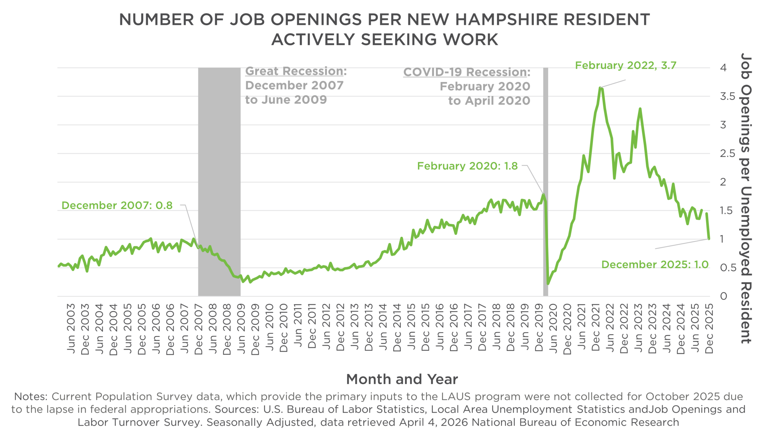 In the years following the COVID-19 pandemic, New Hampshire employers faced a tight labor market. At the peak of market pressures in February 2022, there were an estimated 3.5 job openings for every unemployed person in the state. That ratio averaged 2.9 in 2022 and 2.6 in 2023 before dropping under 2.0 in 2024. By December 2025, there was only about one job opening for every unemployed person.