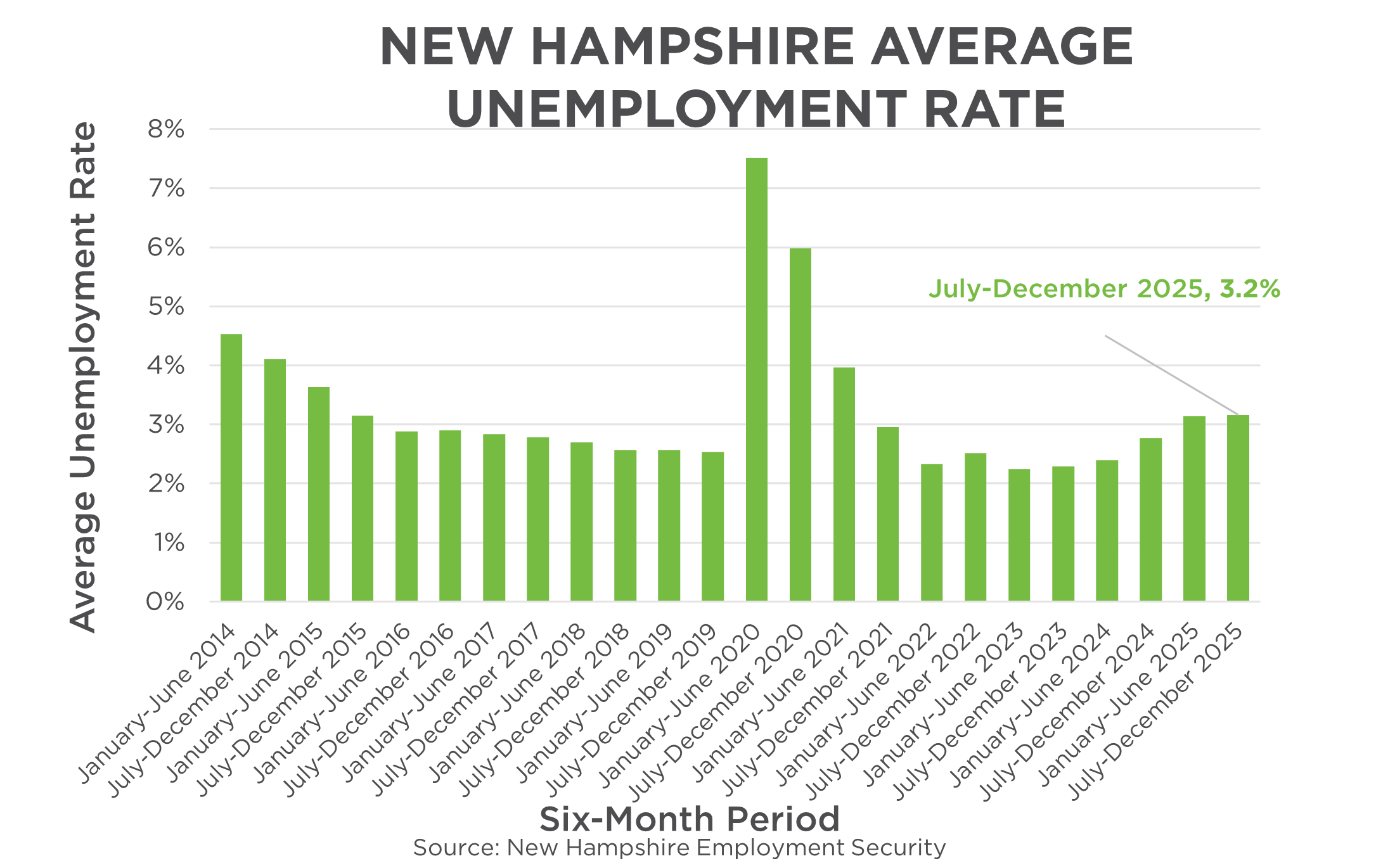 New Hampshire’s labor market remained robust; however, it is not dealing with the tight conditions of the past few post-pandemic years. Hiring slowed and total employment softened over the second half of 2025. Unemployment crept up as more workers entered the labor force, and wage gains have not kept up with inflation. The data suggests that both employers and workers in New Hampshire are facing pressure because of uncertainty in the economy.