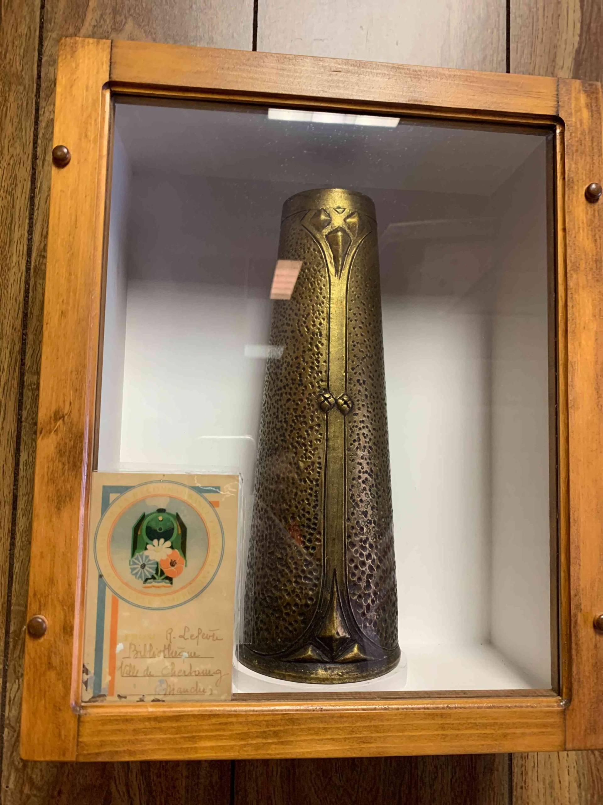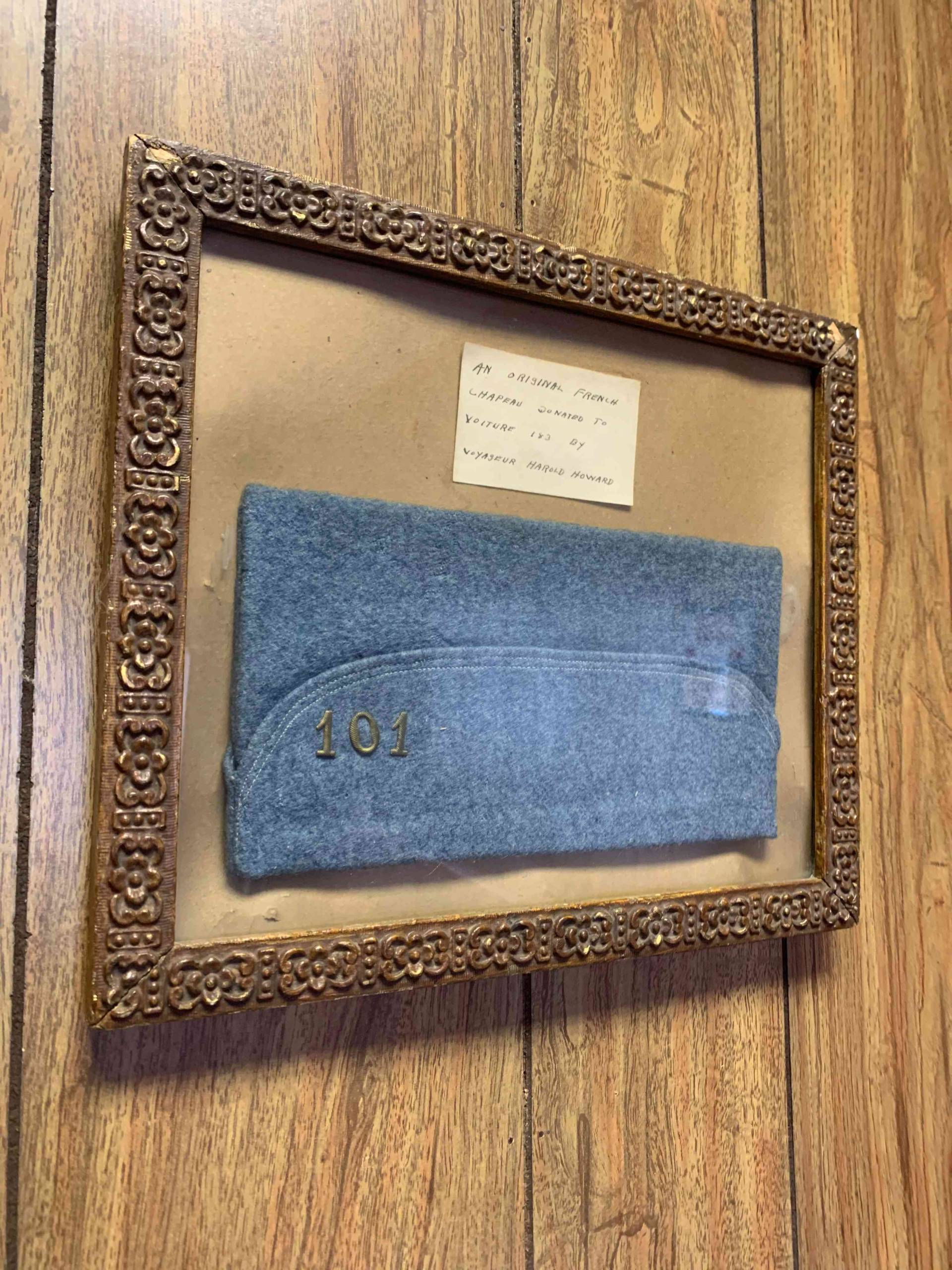 Within the building that houses the Merci boxcar, artifacts line the walls adjacent from the car’s exterior. Notably, Gregoire points out the original horn which he states was found and encased to be displayed along with the original certificate that arrived with the train. Next to this, a framed hat, labeled as a “French Chapeau” that was worn by a member of the Forty and Eight. Most of the original statues, paintings, and artifacts that arrived from France are now believed to be housed at the Franco-American Centre and galleries at Saint Anselm College.