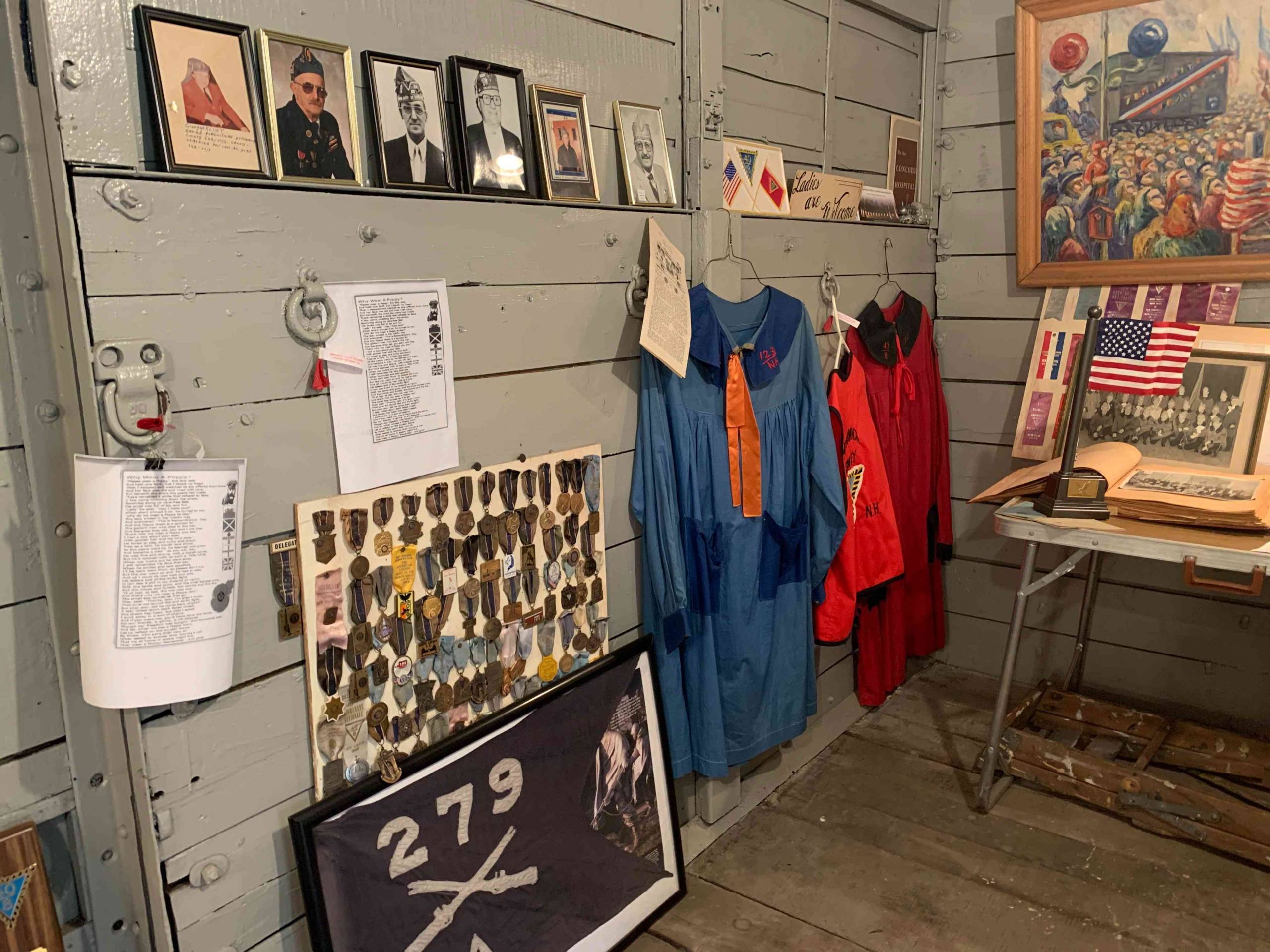 The boxcar’s interior is adorned with photographs of local WWII Veterans. Caseloads of donated medals and plaques from members of the Forty and Eight are propped upright. Pamphlets, news stories dating back to the 1930s and paintings are on display in the corner of the boxcar on a small table.